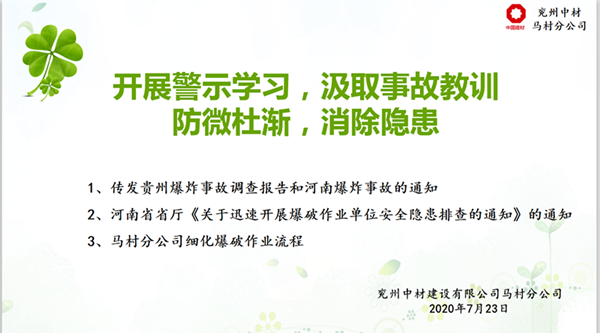 馬村分公司于7月23日下午在會(huì)議室舉行了“開展警示學(xué)習(xí),汲取事故教訓(xùn),牢筑安全防線”的會(huì)議,會(huì)議為大家轉(zhuǎn)發(fā)了《貴州凱里市舟溪鎮(zhèn)“3.19”較大爆炸事故調(diào)查報(bào)告》及河南欒川縣爆炸事故有關(guān)情況、河南省省廳《關(guān)于迅速開展爆破作業(yè)單位安全隱患排查的通知》。同時(shí)為了認(rèn)真貫徹“安全第一、預(yù)防為主”的方針,切實(shí)做好現(xiàn)場(chǎng)安全爆破作業(yè),并規(guī)范管理使用民用爆炸物品的工作,從根本上消除爆破安全隱患,杜絕爆破事故的發(fā)生,實(shí)現(xiàn)安全生產(chǎn),馬村分公司參會(huì)人員學(xué)習(xí)爆破作業(yè)安全規(guī)程的相關(guān)知識(shí)。 學(xué)習(xí)完調(diào)查事故報(bào)告及相關(guān)通知后,分公司涉爆人員紛紛根據(jù)自身工作情況結(jié)合學(xué)習(xí)內(nèi)容積極展開自查自糾活動(dòng),其中結(jié)合分公司公司實(shí)際,管理人員提出以下問題: 分公司執(zhí)行經(jīng)理劉黨提出:一是現(xiàn)場(chǎng)涉爆人員在卸載炸藥時(shí),要輕拿輕放,避免炸藥和地面石塊等發(fā)生碰撞,產(chǎn)生火花發(fā)生殉爆;二是在制作起爆器材時(shí),用木棍先在乳化炸藥包裝上扎眼,再插入電子雷管,禁止用金屬物件,以免發(fā)生安全隱患。 經(jīng)理助理曲光澤提出:一是在民爆物品審批時(shí),一定要按照打孔孔數(shù)申報(bào),提前規(guī)劃、計(jì)算好需要的數(shù)量,防止數(shù)量過多,以免后續(xù)存在安全隱患;二是有爆破作業(yè)時(shí),一定按照河南省公安下發(fā)的通知,爆破工程技術(shù)人員、爆破員(2人)、安全員及保管員(2人)及時(shí)到位,履行各自的職責(zé),并及時(shí)拍照上傳給公安機(jī)關(guān)。 安全員王建平提出:爆破現(xiàn)場(chǎng)要及時(shí)做好安全警戒,用警戒繩劃出爆破范圍;并且爆破作業(yè)區(qū)域內(nèi)禁止吸煙、攜帶打火機(jī),并要求現(xiàn)場(chǎng)人員相互監(jiān)督,及時(shí)制止不安全行為,消除一切安全隱患。 最后由項(xiàng)目經(jīng)理李文軍做最后總結(jié),先是通過對(duì)貴州凱里市舟溪鎮(zhèn)“3.19”較大爆炸事故調(diào)查報(bào)告的學(xué)習(xí),大家要學(xué)習(xí)“四不放過”原則,深刻汲取事故教訓(xùn),防微杜漸,消除隱患。并且著重強(qiáng)調(diào)安全無(wú)小事,尤其是涉及到爆破作業(yè),更要小心謹(jǐn)慎,時(shí)刻謹(jǐn)記“四不傷害”原則,保證自己的安全也要保證他人的安全。更要注意細(xì)節(jié),從民爆物品的審批開始,必須有申請(qǐng)單,根據(jù)炮孔總米數(shù)計(jì)算藥量,爆破工程技術(shù)人員審批后,才可以進(jìn)行民爆信息平臺(tái)的申請(qǐng),后續(xù)的領(lǐng)用、發(fā)放,裝卸,裝藥、填塞,警戒,起爆,爆后檢查等一系列流程,都要保持著細(xì)心、小心、耐心的態(tài)度進(jìn)行各自的工作。同時(shí)要求分公司涉爆人員根據(jù)自己的崗位,細(xì)化流程,盡早擬定一份爆破作業(yè)流程,供分公司人員學(xué)習(xí)。