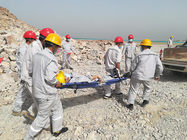 此次演練模擬場景為一名員工從邊坡墜落受傷后的緊急處理過程。接到現(xiàn)場巡視人員報告后,項目部立即啟動應急響應,隨即通知應急救援小組火速趕往事故現(xiàn)場進行救援。警戒疏散組拉起了安全警戒線,封鎖事故現(xiàn)場,維持現(xiàn)場秩序;醫(yī)療救護組檢查傷者情況后,對傷員進行了簡單的救治和護理;技術處置組進入高處墜落現(xiàn)場,進行了高處墜落后的安全檢查,預防次生事故;物資保障組馬上聯(lián)系了醫(yī)院,做好了傷員接收的準備。各小組各司其職,演練現(xiàn)場井然有序,最后救護車輛趕到現(xiàn)場,將傷員送往醫(yī)院,演練活動結束。