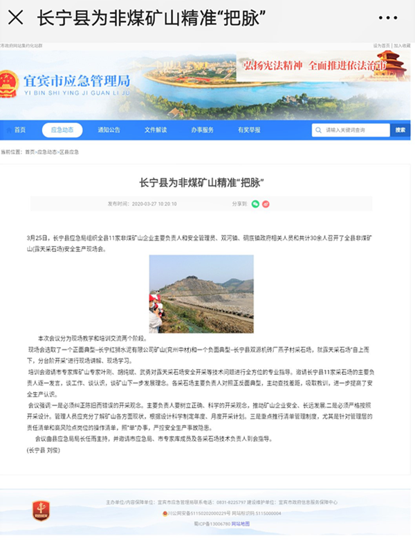 3月25日,宜賓市長寧縣應(yīng)急局組織全縣11家非煤礦山企業(yè)負(fù)責(zé)人和安全管理員、雙河鎮(zhèn)以及硐底鎮(zhèn)政府相關(guān)人員共計(jì)30余人召開了全縣非煤礦山(露天采石場)安全生產(chǎn)現(xiàn)場會。 長寧縣應(yīng)急局邀請兗州中材長寧分公司作為全縣非煤礦山的正面典型為參會企業(yè)分享開采經(jīng)驗(yàn)。 上午9點(diǎn)參會人員到達(dá)長寧分公司―紅獅水泥礦山現(xiàn)場,分公司員工與業(yè)主接待了到場的市縣領(lǐng)導(dǎo)以及企業(yè)參會人員。同時(shí)嚴(yán)格按照防疫要求進(jìn)行體溫測量,人員信息登記入場。   9:30分全部人員到齊,由長寧分公司職工帶領(lǐng)大家參觀礦山現(xiàn)場,為參觀人員介紹礦山整體情況,相關(guān)開采技術(shù),并解答參觀人員提出的問題。    10:30參觀結(jié)束,參觀人員對于此行都感到滿意,我們的礦山工作也得到了大家的認(rèn)可,相關(guān)同仁們都紛紛表達(dá)此行收獲甚多。 現(xiàn)場參觀學(xué)習(xí)結(jié)束后,當(dāng)天下午召開了室內(nèi)培訓(xùn)會,培訓(xùn)會邀請了市專家?guī)鞂<遥瑫r(shí)長寧分公司職工葉剛同志很榮幸在受邀之列。 針對于非煤礦山安全開采等技術(shù)問題,兗州中材長寧分公司作為正面企業(yè)給參會企業(yè)分享了好的經(jīng)驗(yàn),同時(shí)也從會議中汲取了其他好的經(jīng)驗(yàn)方法。 3月27日,宜賓市應(yīng)急管理局報(bào)道了此次會議。此次會議中市縣領(lǐng)導(dǎo)高度評價(jià)了兗州中材長寧分公司的礦山開采工作,同時(shí)被市縣領(lǐng)導(dǎo)評為正面典型我司感到很榮幸。在此后的工作中我們要更努力,爭取更大的進(jìn)步,樹立好我們的企業(yè)形象。 |