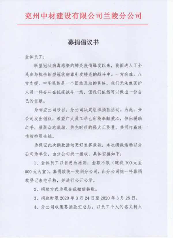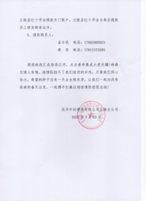陽春三月,乍暖還寒。全國疫情防控工作取得重大勝果接近尾聲之際,仍有很多人士奮斗在抗疫第一線。災(zāi)害無情,人間有愛,近日來,蘭陵分公司積極響應(yīng)公司號(hào)召,組織開展為防控新冠肺炎疫情捐款活動(dòng),助力新冠肺炎疫情防控工作。   蘭陵分公司下發(fā)了《募捐倡議書》,堅(jiān)持自覺自愿與量力而行的原則,呼吁全體員工積極參與,奉獻(xiàn)愛心,捐款助力抗擊疫情。分公司經(jīng)理龔士朋同志帶頭捐款,以實(shí)際行動(dòng)做表率,起到很好的模范作用。在龔經(jīng)理的帶動(dòng)下,分公司全體員工積極響應(yīng),紛紛捐款,每一名員工都獻(xiàn)出一份愛心。  經(jīng)過幾日的募捐,蘭陵分公司共籌集善款8000余元。3月25日,分公司安環(huán)科長孟令民同志,代表分公司將所籌善款轉(zhuǎn)交蘭陵縣紅十字會(huì)。紅十字會(huì)工作人員表示會(huì)將善款上交省紅十字會(huì),全部用于新冠病毒疫情防控工作。并對捐款表示十分感謝,對此崇高的人道主義精神和奉獻(xiàn)愛心的善舉,表示誠摯的敬意。最后頒發(fā)給捐贈(zèng)者榮譽(yù)證書。 涓涓細(xì)流匯成浩浩江河,點(diǎn)點(diǎn)善舉集成大愛無疆!病毒無情人有情。疫情阻擋不了我們前進(jìn)的步伐,只要我們同心協(xié)力,希望的種子總有一天會(huì)生根發(fā)芽,讓我們一起向沒有疾病的春天出發(fā),一起攜手打贏這場疫情防控阻擊戰(zhàn)! |