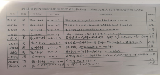 8、我們做了員工排查,建立返崗人員登記制度對(duì)返回人員登記,每天微信群詳細(xì)記錄職工身體狀況、假期外出情況、與重點(diǎn)疫區(qū)人員接觸情況等信息;對(duì)每名員工近14天的去向進(jìn)行排查;對(duì)來自或去過疫情重點(diǎn)地區(qū)的員工建立重點(diǎn)監(jiān)控清單,規(guī)勸其留在當(dāng)?shù)貢翰粡?fù)工,鼓勵(lì)員工延遲上班;對(duì)來自或去過疫情重點(diǎn)地區(qū)的員工排查其抵達(dá)時(shí)間,按規(guī)定落實(shí)醫(yī)學(xué)觀察、隔離等措施,確保其隔離觀察14天并經(jīng)體溫檢測(cè)正常、無不適癥狀后方可上崗。進(jìn)入崗位工作前自覺接受體溫檢測(cè),體溫正常方可進(jìn)入工作區(qū),并洗手消毒。嚴(yán)格執(zhí)行各項(xiàng)疫情防控要求,建立和落實(shí)復(fù)工上崗前個(gè)人防護(hù)知識(shí)培訓(xùn),多種方式普及傳染病防護(hù)知識(shí),做到有癥狀早發(fā)現(xiàn)、早報(bào)告、早隔離、早治療。
