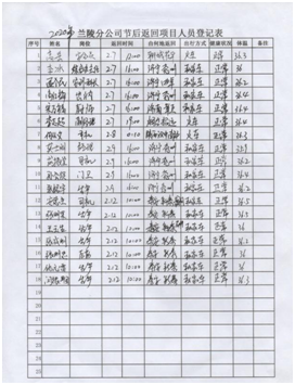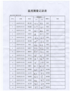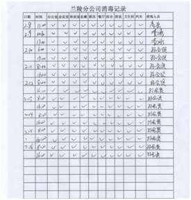 配合當(dāng)?shù)卣w溫監(jiān)測 落實措施,扎實開展防控工作。分公司設(shè)立疫情防控點,配備防護口罩、手套、防護鏡、體溫計及測溫槍、酒精、84消毒液、噴霧器等防護物資。嚴(yán)格控制返程人員,對居住或經(jīng)過疫情防控重點區(qū)域人員,要求暫不返回項目部,居家隔離自我觀察;要求返回項目部人員,返程路上嚴(yán)格落實個人防控措施,制定記錄表,對返回人員嚴(yán)格檢查、登記;返回項目部后,在項目部內(nèi)自行隔離14天,每天早晚測量體溫并做好記錄。    返程人員登記 每日體溫監(jiān)測 集中開展項目部衛(wèi)生消毒工作。分公司通過多種渠道,購進酒精、84消毒液等藥品,每天上午下午各進行一次集中消毒工作,辦公室、會議室、廚房、餐廳、宿舍、衛(wèi)生間、走廊、院內(nèi)邊邊角角,全面消殺。  項目部消毒 消毒記錄