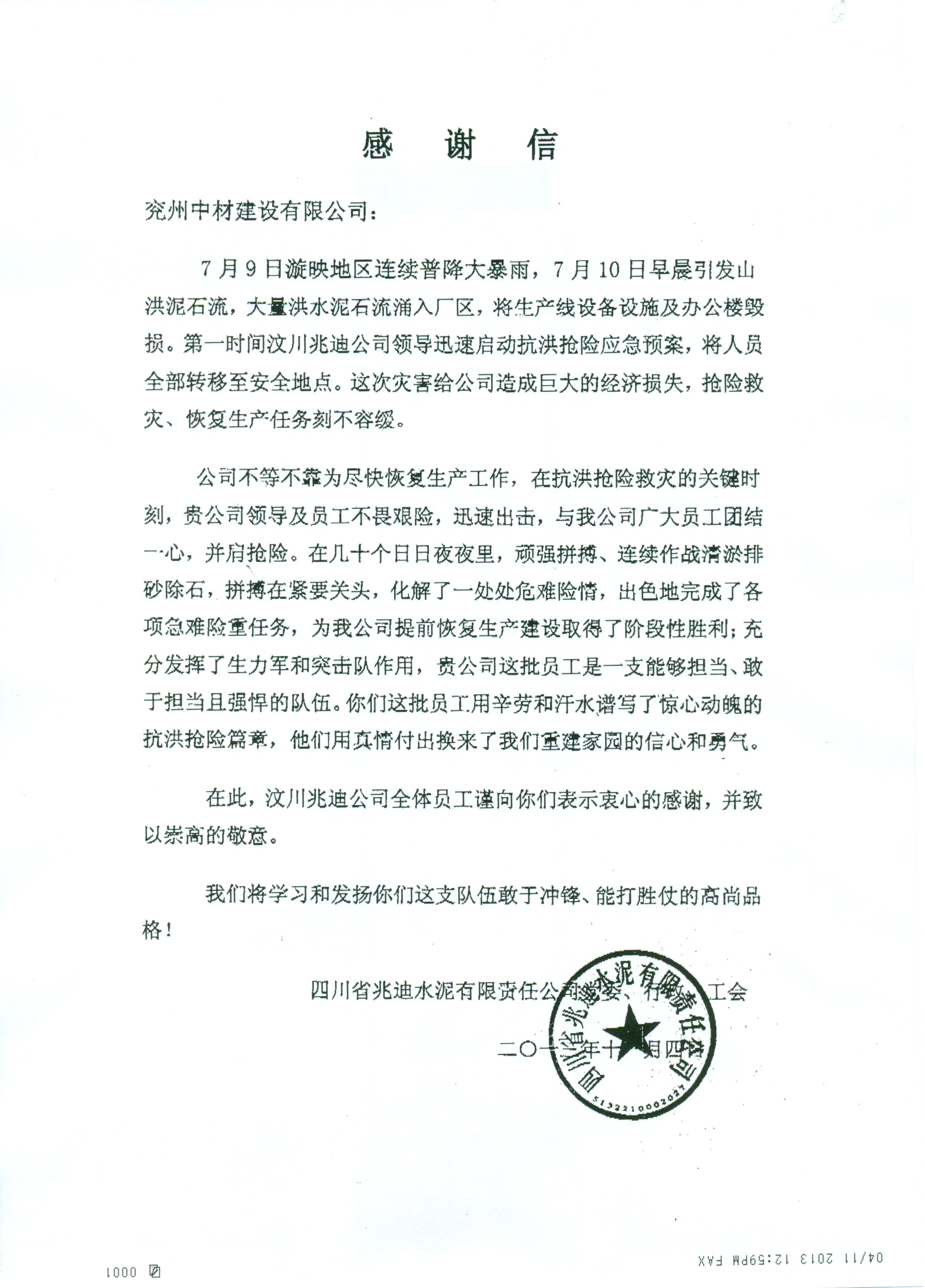 四川省兆迪水泥有限責(zé)任公司發(fā)來的感謝信!