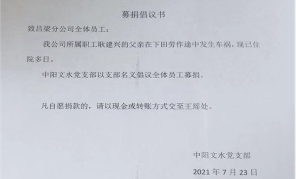 呂梁分公司某員工的父親因車(chē)禍住進(jìn)ICU搶救多日,每天開(kāi)銷(xiāo)巨大。中陽(yáng)文水黨支部經(jīng)過(guò)全體會(huì)議通過(guò)發(fā)起愛(ài)心捐款活動(dòng)。