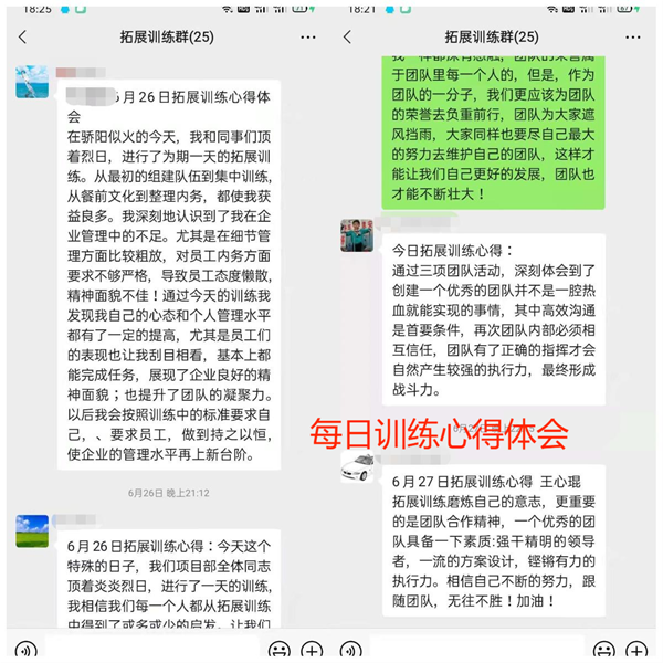 二、禮儀著裝與內(nèi)務(wù)整理 禮儀著裝和內(nèi)務(wù)不僅僅代表了個(gè)人的素質(zhì)與形象,更是一個(gè)集體精神面貌的體現(xiàn)。此次訓(xùn)練過后所有人的精神面貌都煥然一新,一改以前的無精打采,都變得精神抖擻;生活區(qū)的內(nèi)務(wù)也由“臟亂差”變成“潔凈美”,整個(gè)生活區(qū)都干干凈凈。 三、拓展訓(xùn)練 拓展訓(xùn)練旨在培養(yǎng)一個(gè)團(tuán)隊(duì)的凝聚力,核心指揮力,高效執(zhí)行力,團(tuán)隊(duì)協(xié)作力。 團(tuán)隊(duì)與團(tuán)隊(duì)之間競(jìng)爭(zhēng)時(shí)候的拼勁,體現(xiàn)了大家強(qiáng)烈的集體榮譽(yù)感,雖然競(jìng)爭(zhēng)有輸贏,但是我們看到了競(jìng)爭(zhēng)中大家相互配合,相互鼓勵(lì),相互成長(zhǎng)的過程,我想這應(yīng)該才是競(jìng)爭(zhēng)真正的意義所在。 項(xiàng)目的成功與否,有許多環(huán)節(jié)―有效的工作方案、正確的團(tuán)隊(duì)指揮、高標(biāo)準(zhǔn)的執(zhí)行力、結(jié)果的及時(shí)反饋、經(jīng)驗(yàn)與教訓(xùn)的汲取等等這些因素都是成功必不可少的。 訓(xùn)練結(jié)束后,分公司經(jīng)理宋道明對(duì)三天的培訓(xùn)成果進(jìn)行了驗(yàn)收,肯定了此次培訓(xùn)的成果,并再次強(qiáng)調(diào)了訓(xùn)練的目的:希望通過此次培訓(xùn)來提升員工的綜合素質(zhì),工作執(zhí)行力;讓大家充分意識(shí)到相互溝通學(xué)習(xí)的重要性,從苦和累中學(xué)習(xí)體會(huì),從言談舉止中受益;培養(yǎng)嚴(yán)謹(jǐn)?shù)墓ぷ髯黠L(fēng)和認(rèn)真的學(xué)習(xí)態(tài)度,為工作中高標(biāo)準(zhǔn)、嚴(yán)要求打下堅(jiān)實(shí)的基礎(chǔ),為企業(yè)的長(zhǎng)遠(yuǎn)發(fā)展貢獻(xiàn)一份力量。訓(xùn)練雖然結(jié)束了,但是挑戰(zhàn)才剛剛開始,我們?cè)谝院蟮墓ぷ骱蜕钪?,要將此次?xùn)練的標(biāo)準(zhǔn)作為今后的準(zhǔn)則,要持之以恒的堅(jiān)持下去,為企業(yè)的發(fā)展貢獻(xiàn)我們自己的一份力量。