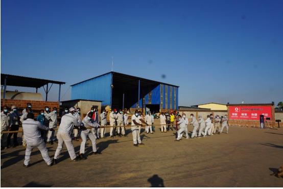 舉行以各生產(chǎn)部門為團隊的拔河比賽,圖片為中方員工組成團隊與贊方員工比賽圖。